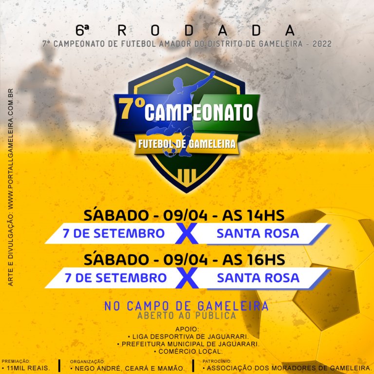 Neste sábado, dia (09) às 14hs no distrito de Gameleira/Jaguarari, acontecera a 6ª RODADA do 7º CAMPEONATO DE FUTEBOL AMADOR DO DISTRITO DE GAMELEIRA - 2022. Em seguida, FESTA DANÇANTE.